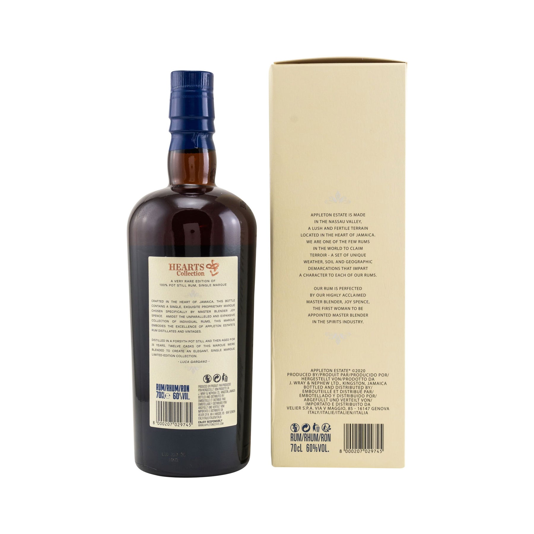 Gemeinsam wählten sie drei hervorragende Rums aus, die bei Rum-Liebhabern bereits seit Ankündigung der Serie für Herzklopfen sorgen. Als erste ihrer Art in der Geschichte der Brennerei besteht die Hearts Collection aus zu 100 Prozent in Pot Stills destillierten Single Mark Rums. Destilliert in den Jahren 1994, 1995 und 1999, gönnte man den Rums der exklusiven Serie großzügige Reifezeiten im tropischen Klima des Nassau Valley auf Jamaika. Nach 21- bis 26-jähriger Reife wurden je zwölf Fässer desselben Marques miteinander zur Appleton Hearts Collection verblendet. Zwei der drei Marques sind identisch – welche genau, bleibt Joy Spences Geheimnis.